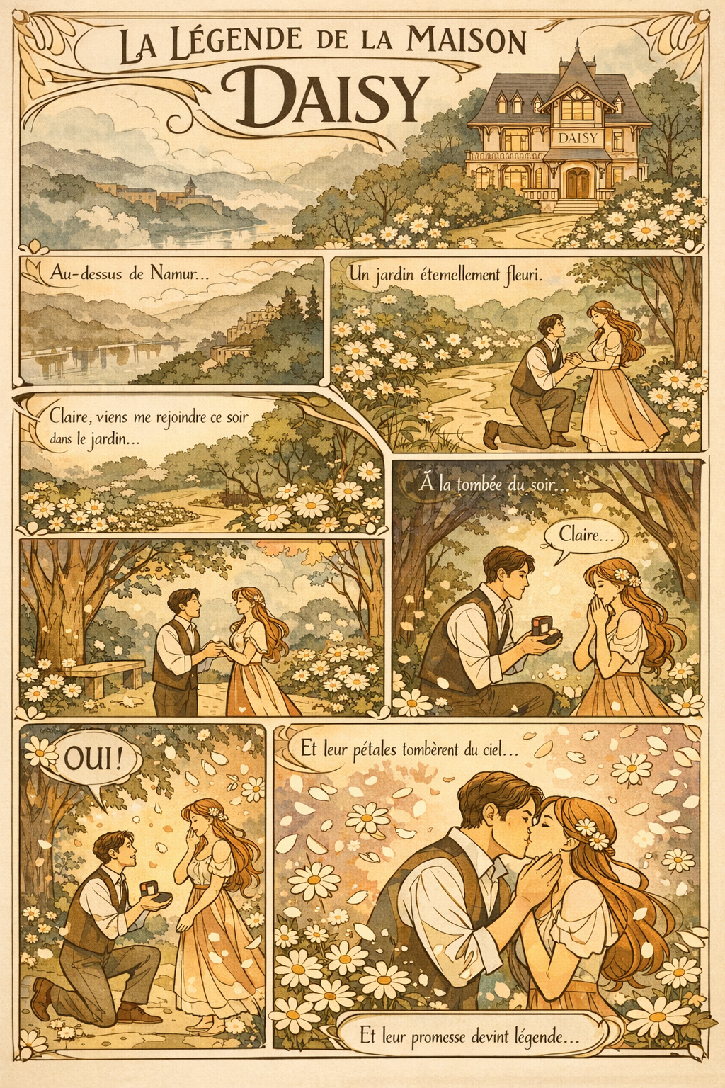 Un soir d’été, alors que le soleil disparaissait derrière la citadelle, teintant le ciel de rose et d’or, Émile Marguerite invita sa bien-aimée, Claire, à le rejoindre dans le jardin. Les lucioles dansaient, et une légère brise faisait frissonner les pétales blancs des marguerites qui bordaient l’allée.